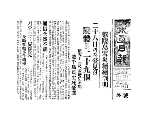 - 鬱陵島(울능도) 全島(전도)에는 한달동안繼續降雪(계속강설)