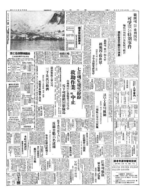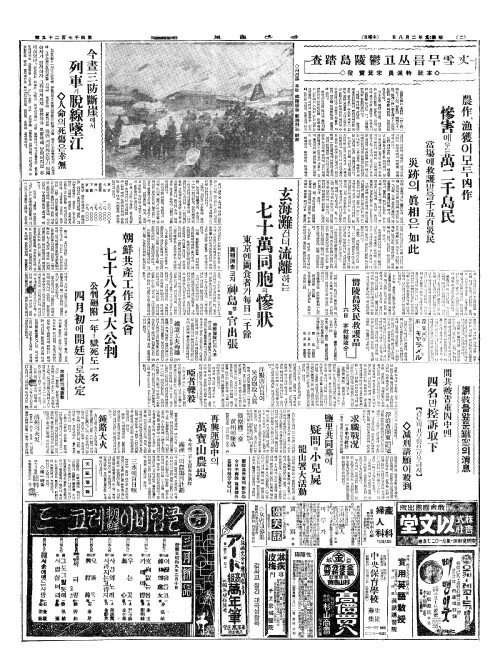 - 鬱陵島雪害(울릉도설해)에 對(대)하야 今日不再錄(금일부재녹) 寫眞號外(사진호외)를發行(발행)하얏습니다