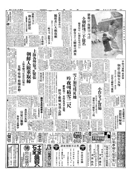 - 大雪崩(대설붕)으로校舍倒壞(교사도괴) 兒童八名(아동팔명)이깔려