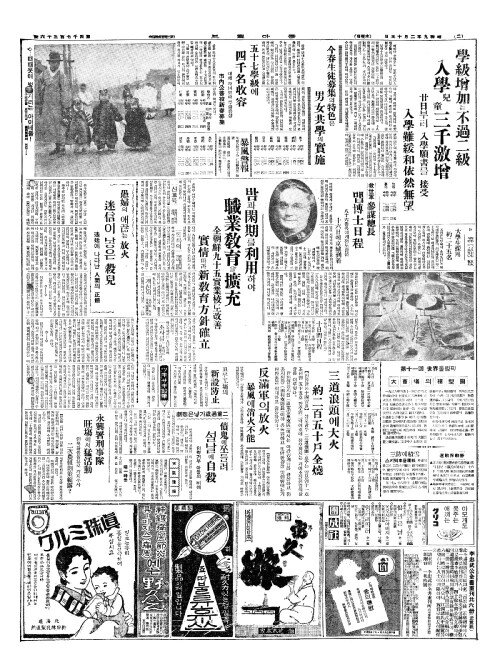 - 學級增加(학급증가)는不過二級(부과이급) 入學兒童三千激增(입학아동삼천격증)