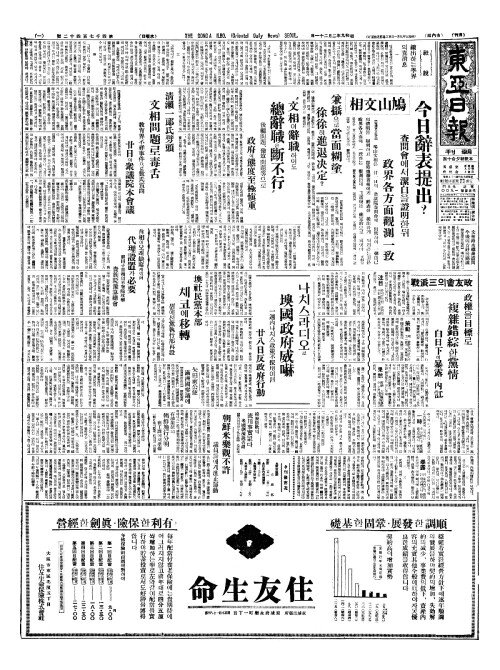 - 鳩山文相(구산문상) 今日辭表提出(금일사표제출)?查問會(사문회)에서潔白(결백)을證明(증명)한뒤 政界各方面觀測一致(정계각방면관측일치)