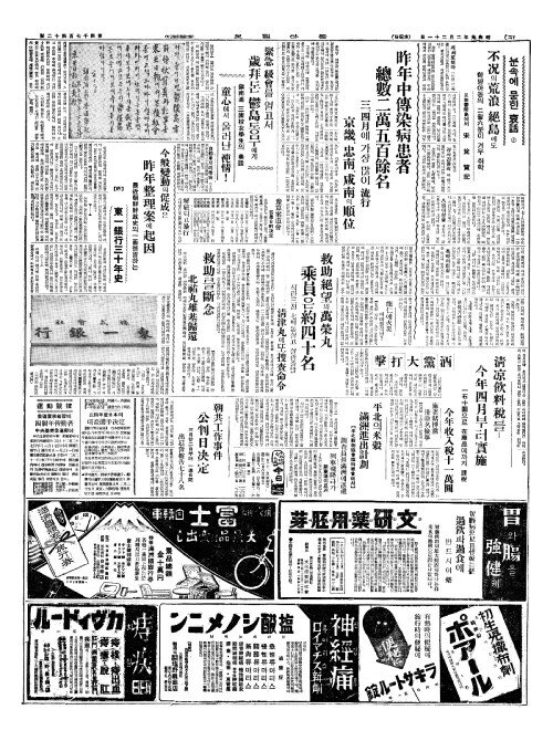 - 昨年中傳染病患者(작년중전염병환자) 總數二萬五百餘名(총수이만오백여명)