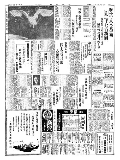 - 昨年中(작년중)의風水被害額(풍수피해액) 勿驚二千七百萬圓(물경이천칠백만원)