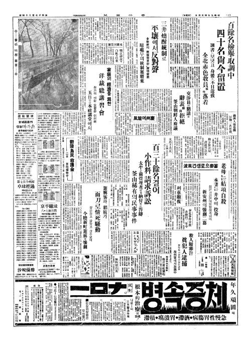 - 百餘名檢擧取調中(백여명검거취조중) 四十名尙今留置(사십명상금유치)