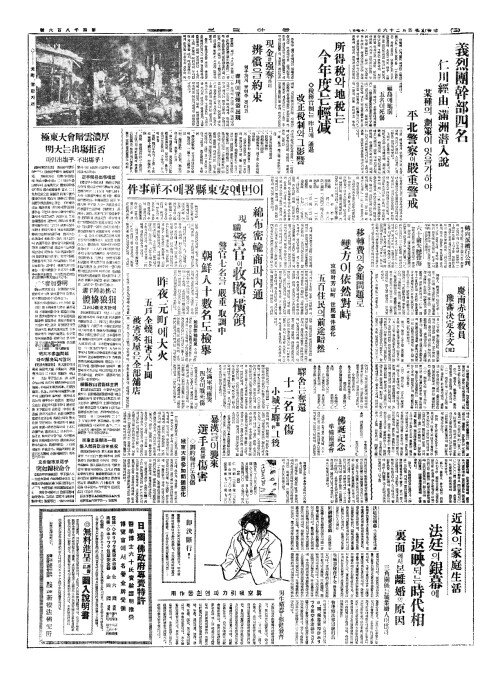 - 昨夜(작야)、元町(원정)에大火(대화) 五戶全燒(오호전소)、損害八十圓(손해팔십원)