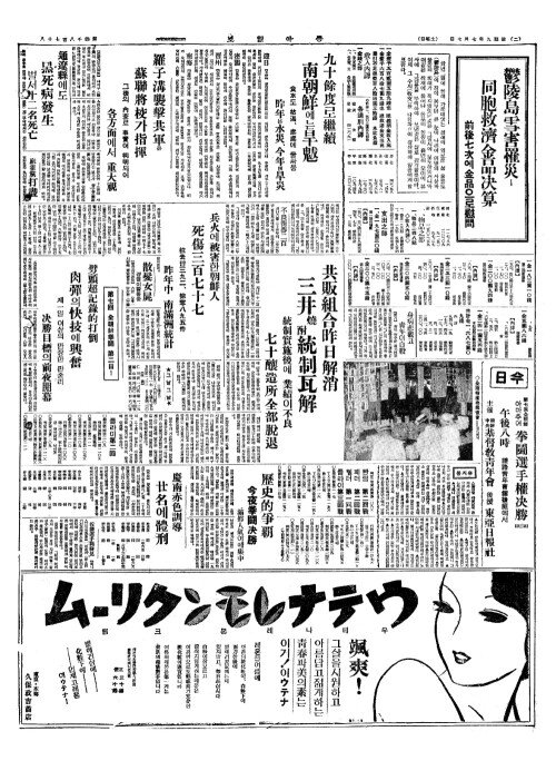 - 共販組合昨日解消(공판조합작일해소) 三井燒酎統制瓦解(삼정소주통제와해)