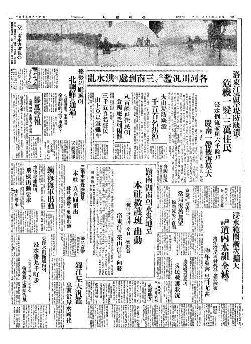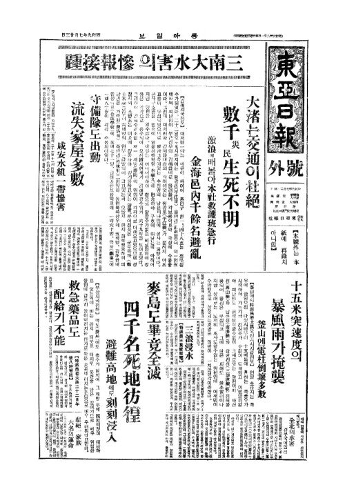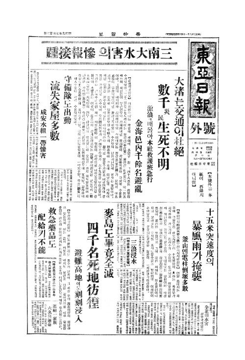 - 守備隊(수비대)도出動(출동) 流失家屋多數(류실가옥다삭)