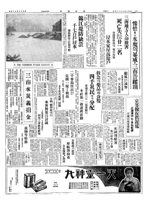 - 救急(구급)의藥品(약품)과食糧(식량) 四千災民(사천재민)에게分配(분배) 交通不能(교통부능)으로 三浪津驛(삼랑진역)서 本社第一救護班活動(본사제일구호반활동)