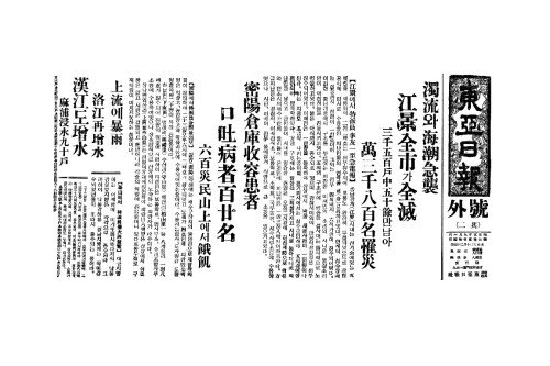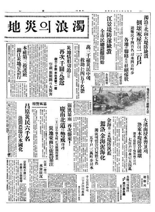 - 濁浪(탁낭)에北面大堤防缺潰(북면대제방결궤) 倒壞家屋(도괴가옥)만이二百戶(이백호) 避難民千四百名(피난민천사백명)、浸水四百町步(침수사백정보)