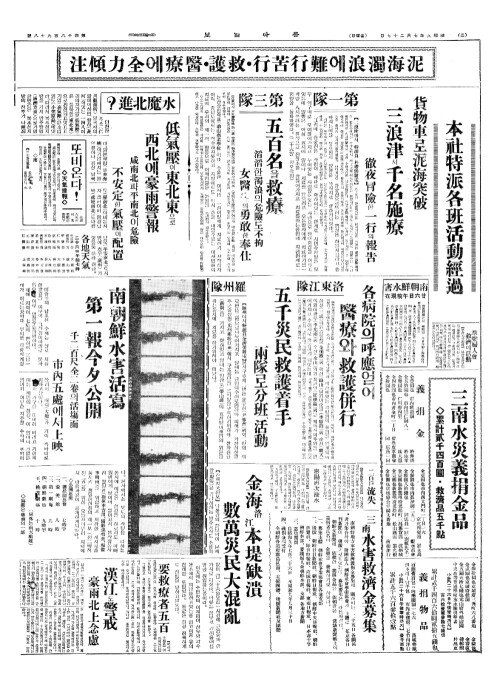 - 羅州隊(라주대) 五千災民救護着手(오천재민구호저수) 兩隊(양대)로分班(분반)、活動(활동)