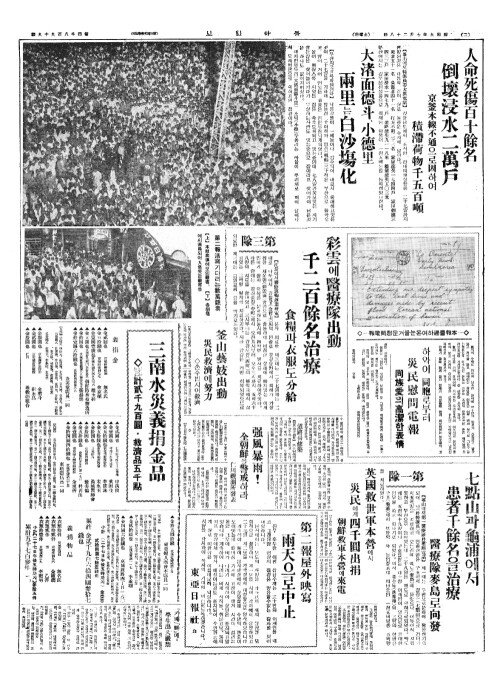 - 人命死傷百十餘名(인명사상백십여명) 倒壞浸水二萬戶(도괴침수이만호)