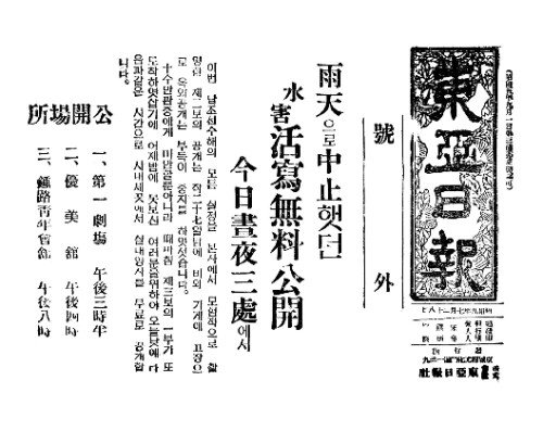 - 本社特撮(본사특촬) 活寫(활사) 第二報(제이보)또公開(공개) 今夕市內各處(금석시내각처)에서