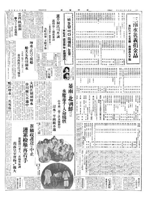 - 三南水災義捐金品(삼남수재의연금품) 累計六千七百圓(라계륙천칠백원)·救濟品七千點(구제품칠천점)