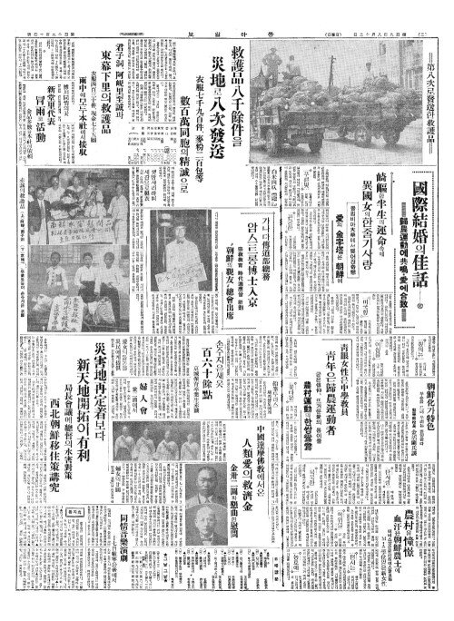 - 救護品八千餘件(구호품팔천여건)을 災地(재지)로八次發送(팔차발송)