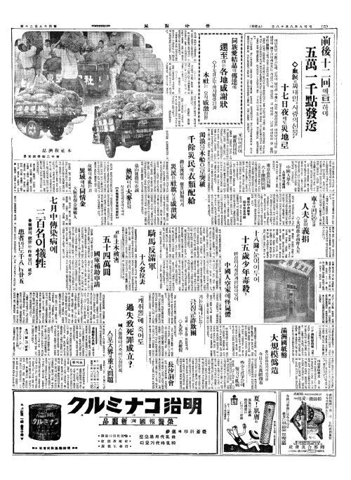 - 災地各處(재지각처)를巡歷(순역) 要急救民(요급구민)에配給(배급)