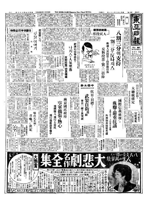 - 獨總統兼攝(독총통겸섭) 人民投票(인민투표) 八割三分(팔할삼분)이支持(지지) 一割三分(일할삼분)은反(반)나치스