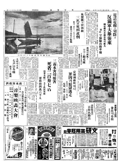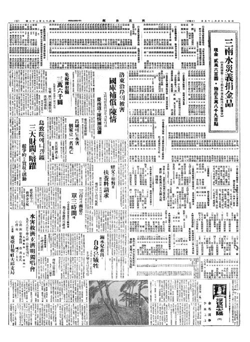 - 三南水災義捐金品(삼남수재의연김품)【本社接受(본사접수)=二十四日午後五時(이십사일오후오시)까지整理分(정이분)】現金(현김) 貳萬六百圓(이만륙백원)·物品五萬八千九百點(물품오만팔천구백점)