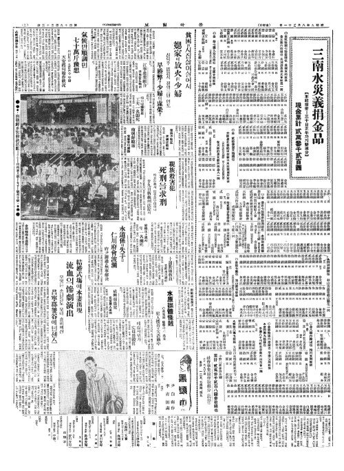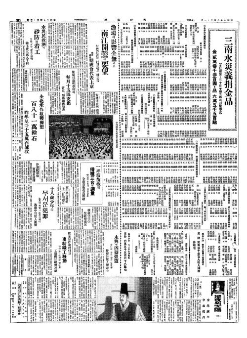 - 三南水災義捐金品(삼남수재의연김품)【本社接受(본사접수)=三十日午後五時(삼십일오후오시)까지整理分(정리분)】金貳萬參千參百圓(김이만참천참백원)·品(품) 六萬五千五百點(륙만오천오백점)