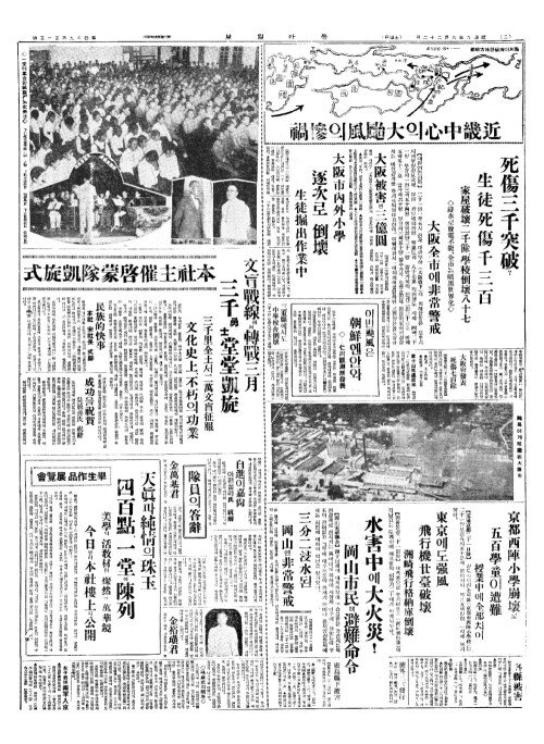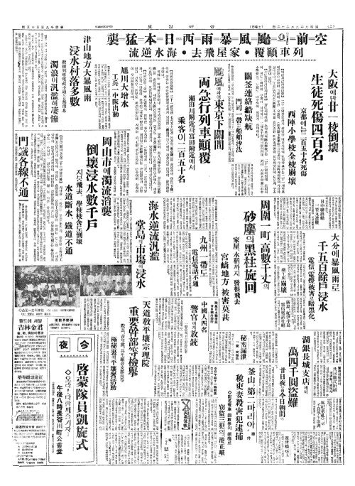 - 空前(공전)의颱風暴雨西日本猛襲(태풍폭우서일본맹습) 列車顚覆(렬차전복)·家屋飛去(가옥비거)·海水逆流(해수역류)