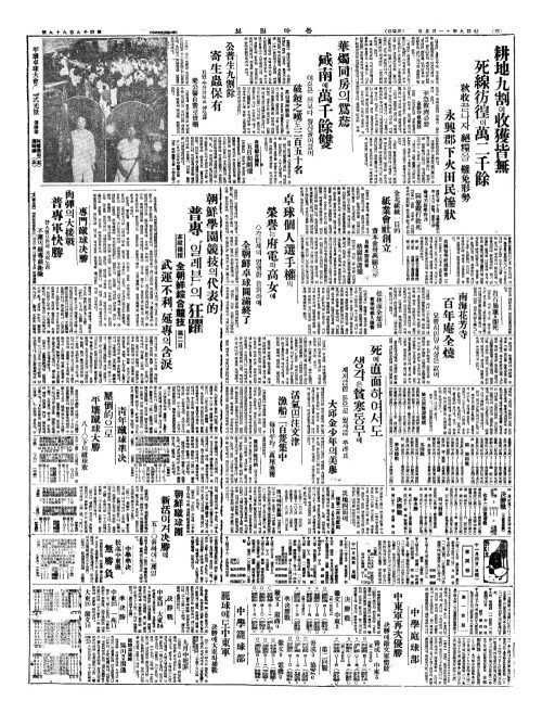 - 本社後援(본사후원) 朝鮮體育會創立十五週年記念(조선체육회창입십오주년기념) 全朝鮮綜合竸技(전조선종합경기) 第三日(제삼일) 待望(대망)의陸上竸技(륙상경기)
