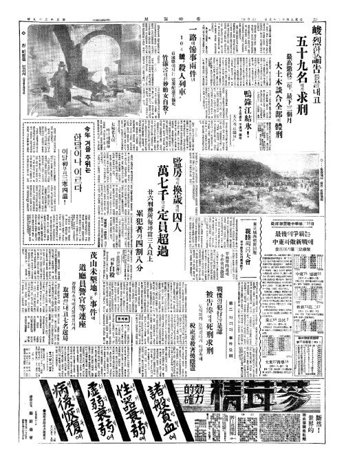 - 被吿(피고)들의罪狀(죄상)을痛擊(통격) 秋霜烈日(추상렬일)같이論吿(론고) 五十九名(오십구명)의處斷(처단)은 果如何(과여하)?