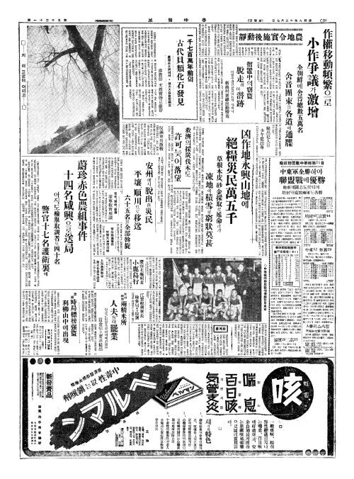- 凶作地永興山地(흉작지영흥산지)에 絕糧災民萬五千(절량재민만오천)