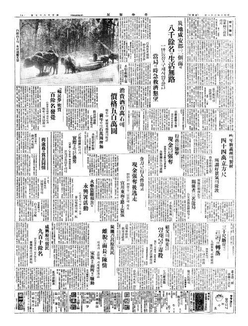 - 盤山縣窮民五萬(반산현궁민오만) 每日千餘名作隊陳情(매일천여명작대진정)