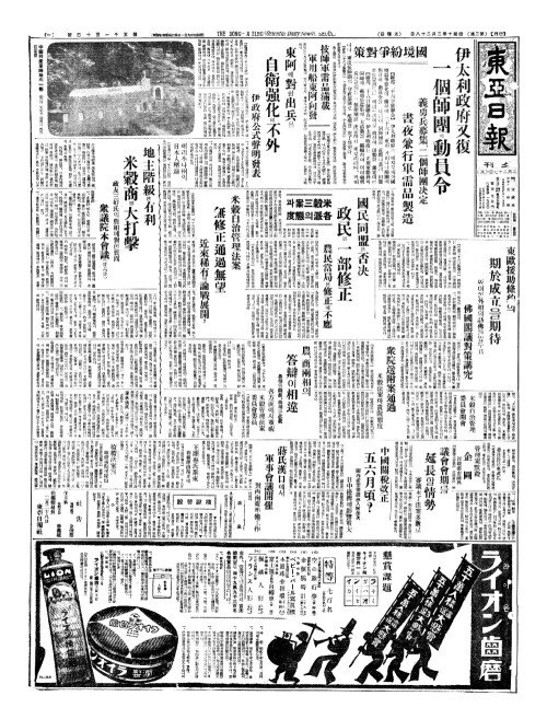 - 國境紛爭對策(국경분쟁대책) 伊太利政府又復(이태리정부우복) 一個師團(일개사단)에動員令(동원령)