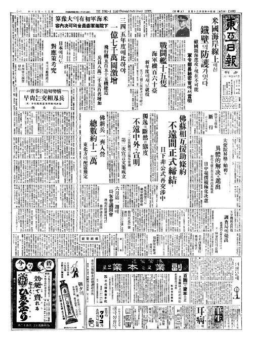 - 米海軍初有(미해군초유)의大豫算(대예산) 下院海軍委員會(하원해군위원회)의可决內容(가결내용) 三四(삼사)、五年度(오년도)에比(비)하야 一億七千萬圓激增(일억칠천만원격증)