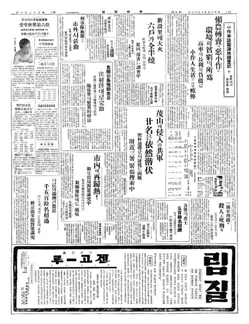 - 新設里(신설리)에大火(대화) 六戶(륙호)가全半燒(전반소)