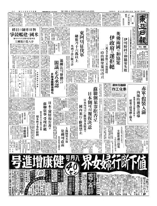 - 무首相東阿(수상동아)에 親(친)히戰線(전선)을視察(시찰) 討(토)에軍鼓舞决定(군고무결정) 又復五萬軍動員(우복오만군동원)
