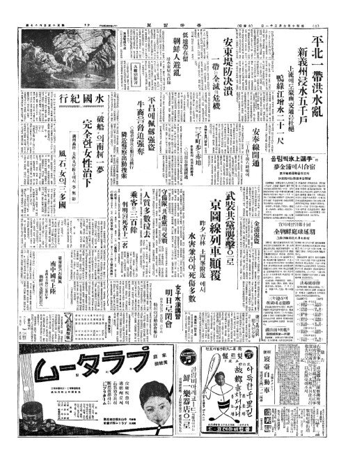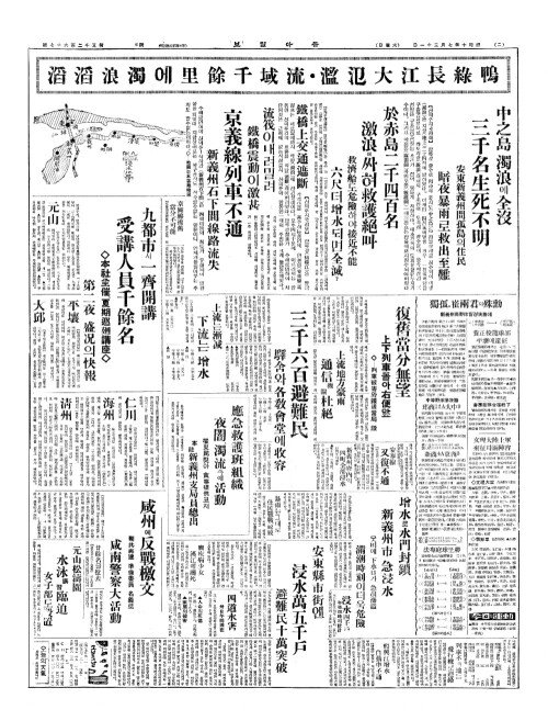 - 安東縣市街(안동현시가)엔 浸水萬五千戶(침수만오천호) 避難民十萬突破(피난민십만돌파)