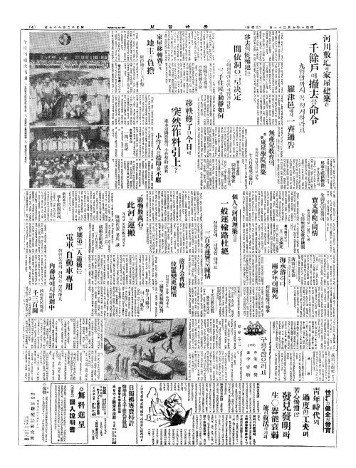 - 河川敷地(하천부지)에家屋建築(가옥건축)한 千餘戶(천여호)에撤去(철거)를命令(명영)