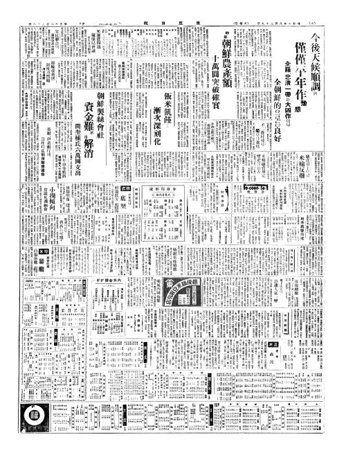 - 昨年朝鮮農產額(작년조선농산액) 十萬圓突破確實(십만원돌파확실)