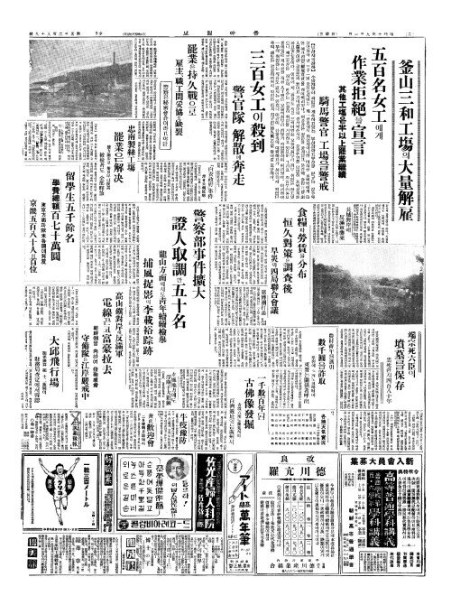 - 三百女工(삼백여공)이殺到(살도) 警官隊(경관대) 解散(해산)에奔走(분주)