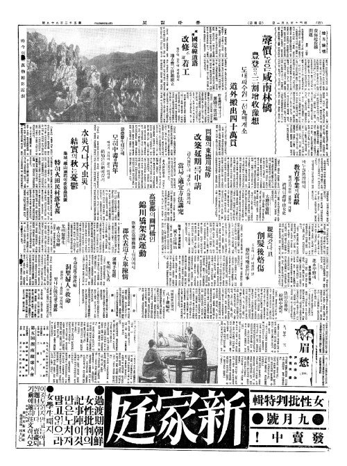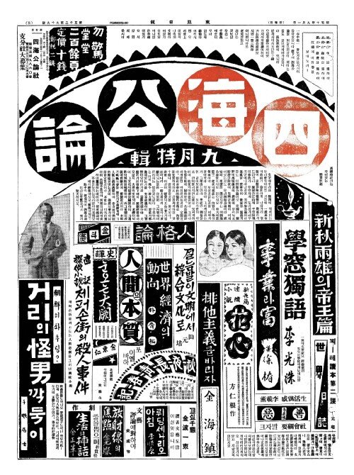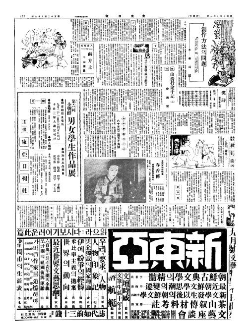 - 本報創刋十五週年記念(본보창천십오주년기염) 公募長篇小說(공모장편소설) 沈熏作(심훈작)"常綠樹(상녹수)"靑田畵(청전화)