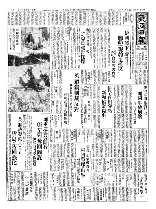 - "伊國(이국)、戰爭(전쟁)에訴(소)한것은 聯盟規約(련맹규약)에 違反(위반)"