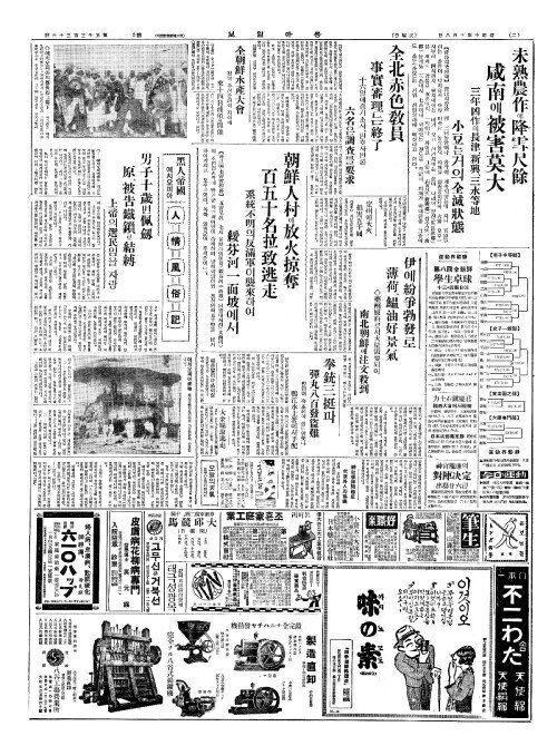 - 未熟農作(미숙농작)에 降雪尺餘(강설척여) 咸南(함남)에被害莫大(피해막대)