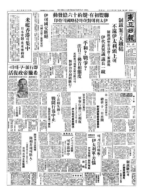 - 聯盟初有(련맹초유)의規約十六條發動(규약십육조발동) 伊太利(이태리)에對(대)하야侵略國(침략국)의烙印(낙인) 制裁案(제재안)의大鐵槌(대철추) 不遠伊太利頭上(부원이태리두상)에