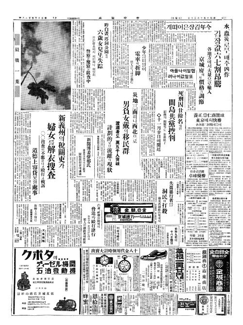 - 山東方面出漁中(산동방면출어중) 百餘漁父失踪(백여어부실종)