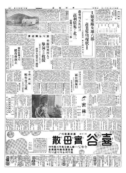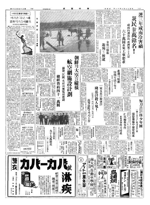 - 連三年咸南冷害禍(연삼년함남냉해화) 災民廿萬餘名(재민입만여명)!