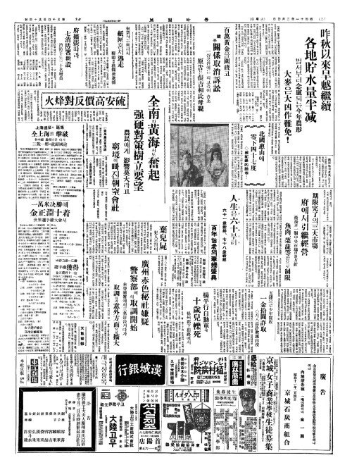 - 昨秋以來旱魃繼續(작추이내한발계속) 各地貯水量半减(각지저수량반감)