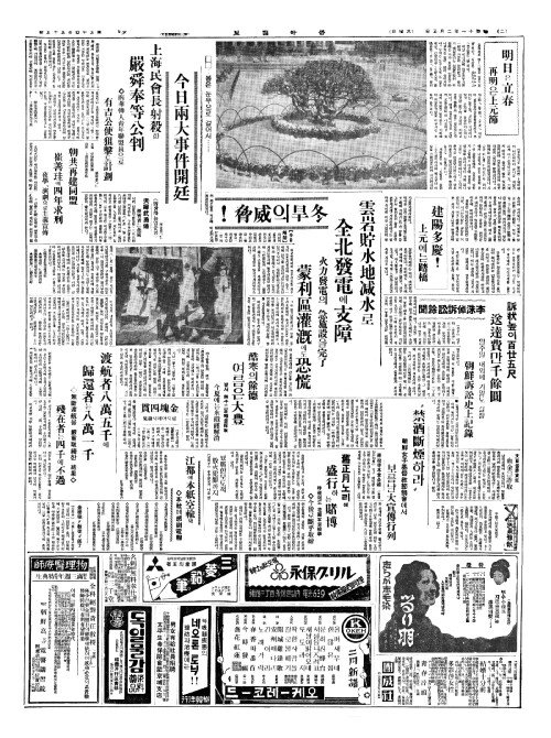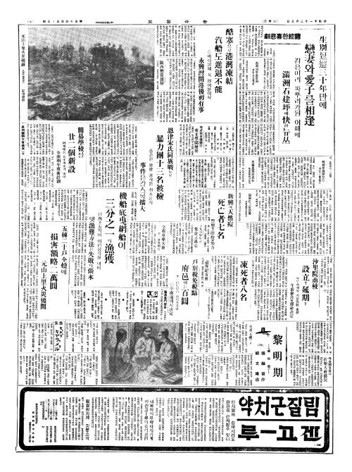- 酷寒(혹한)으로港灣凍結(항만동결) 汽船(기선)도進退不能(진퇴부능)