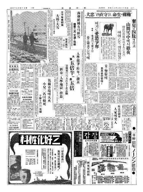 - "襁褓(강보)의生命(생명)"을守直(수직)한"忠犬(충견)" 棄兒(기아)를四肢(사지)에품고 山間雪中(산간설중)에서徹夜(철야)