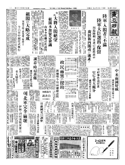 - 中(중)、米兩國好感(미양국호감) 廣田新內閣(광전신내각)에對(대)하야