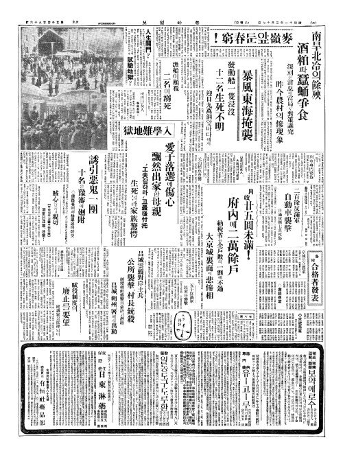 - 暴風東海掩襲(폭풍동해엄습) 發動船一隻浸沒(발동선일척침몰) 十二名生死不明(십이명생사부명)
