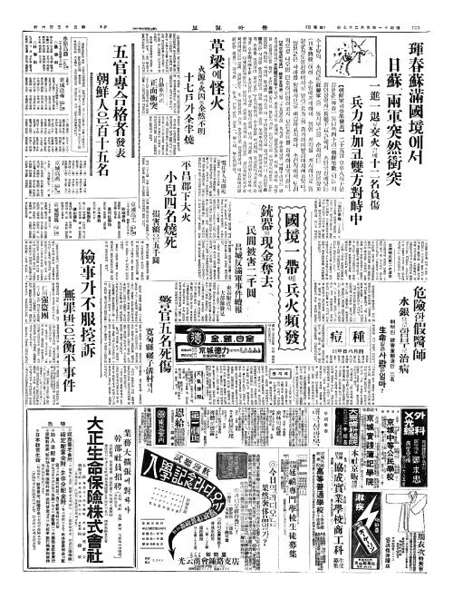 - 琿春蘇滿國境(혼춘소만국경)에서 日蘇(일소)、兩軍突然衝突(양군돌연충돌)