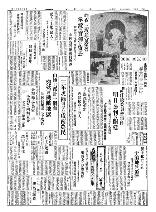 - 三年災餘(삼년재여)에우는咸南農民(함남농민) 山地六郡卅一個面(산지륙군삽일개면) 宛然(완연)한饑餓地獄(기아지옥)