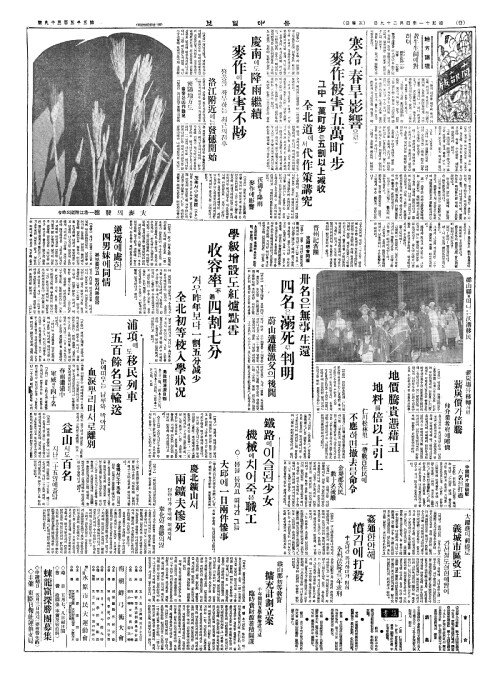 - 寒冷(한냉)、春旱影響(춘한영향)으로 麥作被害五萬町步(맥작피해오만정보)