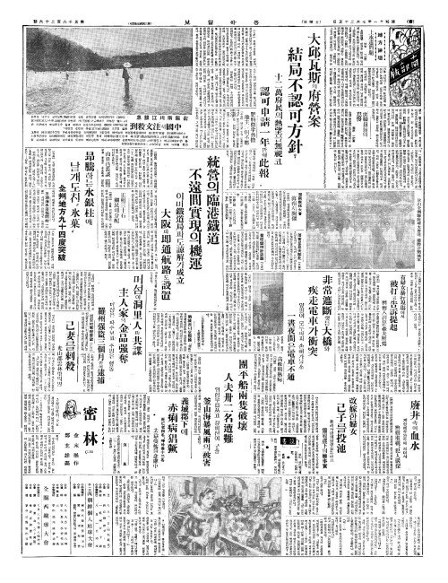 - 團平船兩隻破壞(단평선량척파괴) 人夫卅二名遭難(인부삽이명조난)